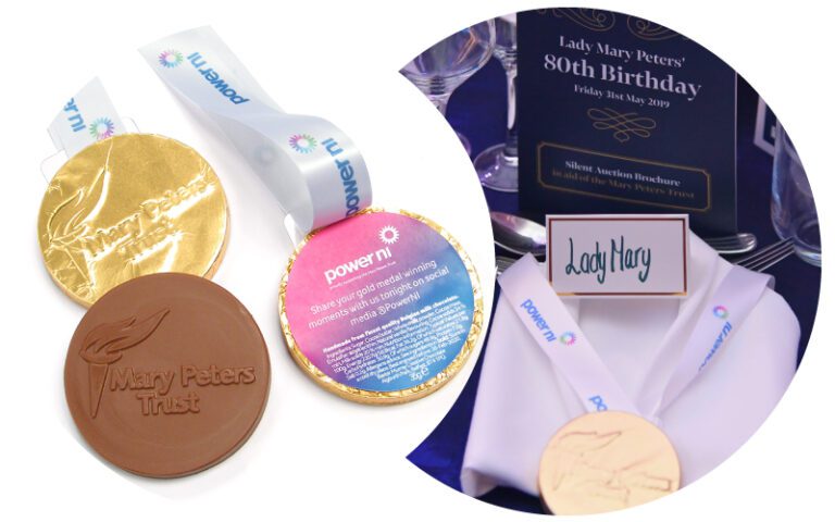 To start the production process all we needed from the client were copies of the Mary Peter Trust and Power NI logos. With these we set up the bespoke chocolate mould and print layout for the ribbon & ingredients label. Once approved we set to work, our chocolate production team handcrafted the logo chocolates and once wrapped in gold foil added the Power NI branded lanyard and label.