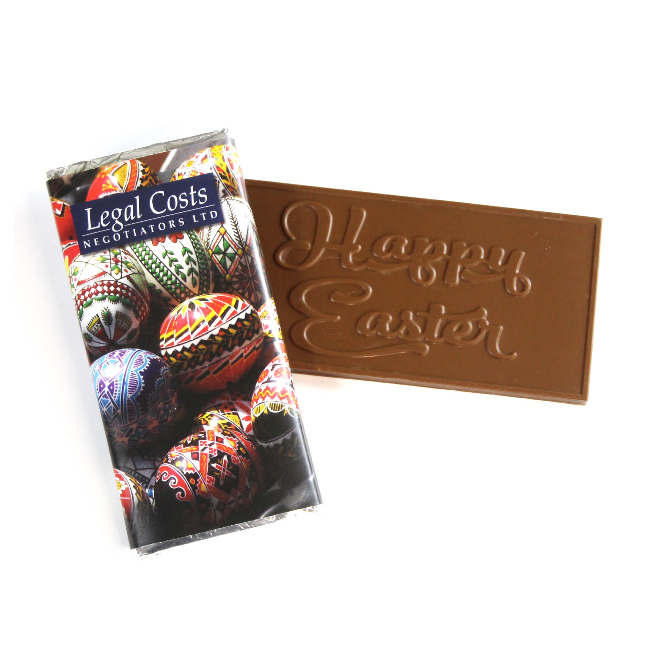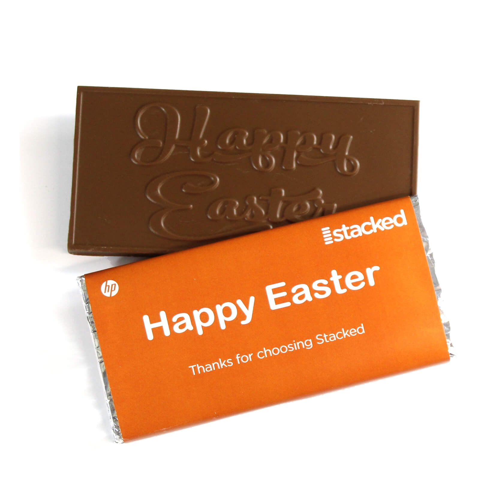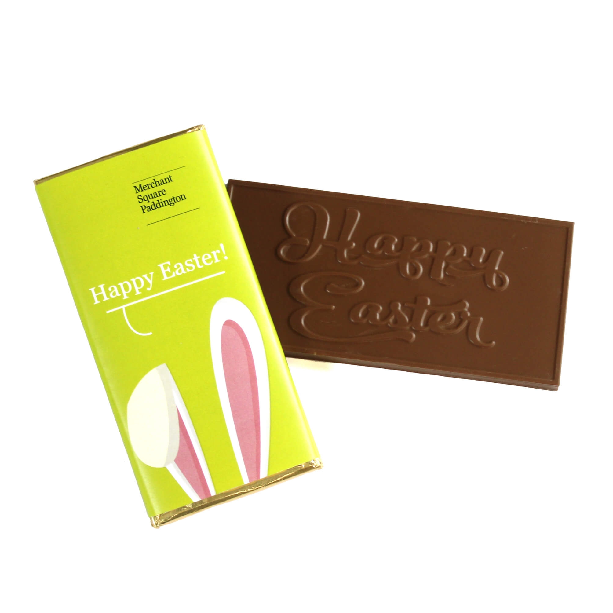 - Happy Easter message moulded into the chocolate bar.