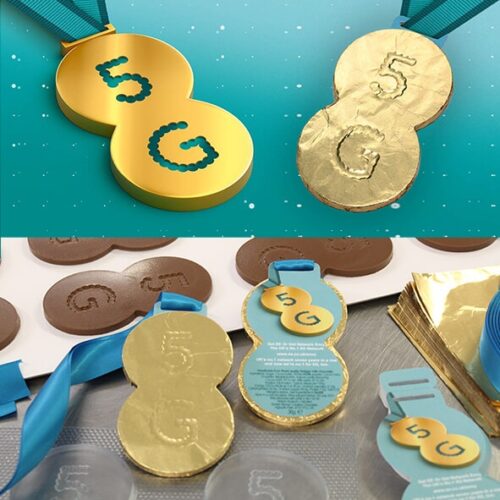 Let’s start with a bespoke coin, add a ribbon and you have a medal. Corporate chocolate medals are perfect gifts for sponsoring sports events and are fun prizes at company team building days.
